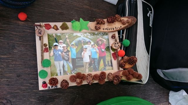 朝ごはんのサンドイッチとバナナを食べたあと、テントをきれいにたたんで、クラフト製作でフォトフレームの飾りつけをしました。
