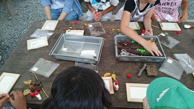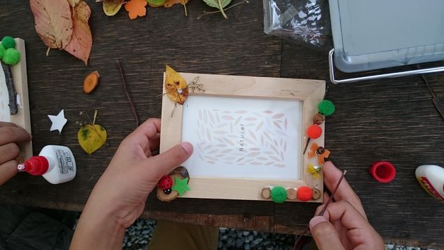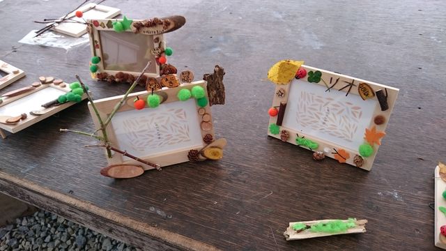 小枝、葉っぱ、切り株などの可愛いアイテムを選んでボンドでつけてるのですが、子どもたちの発想は豊かだな~と感心しました。