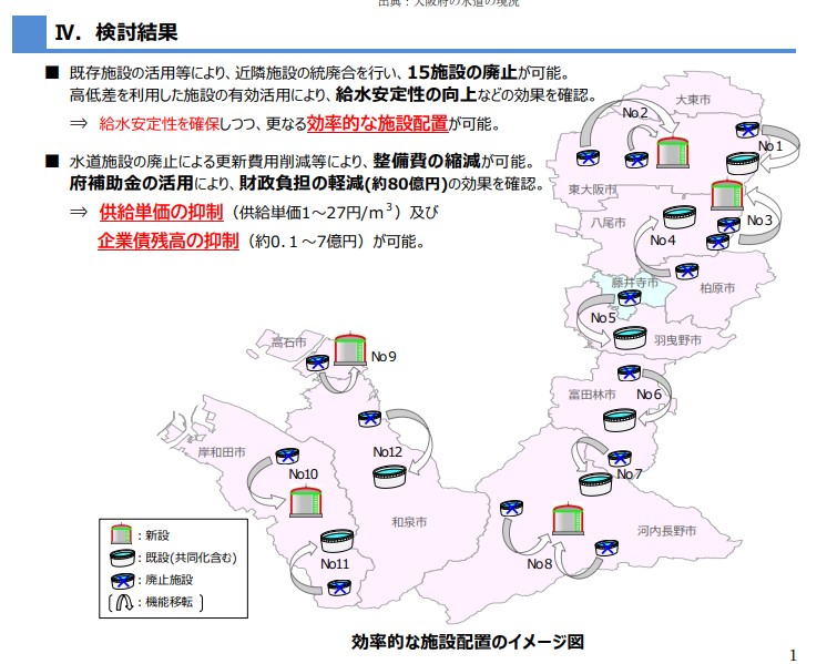 平成24年に大阪府が『大阪府水道整備基本構想(おおさか水道ビジョン)』(PDFはこちら)を策定し、府域一水道を最終目標としています。