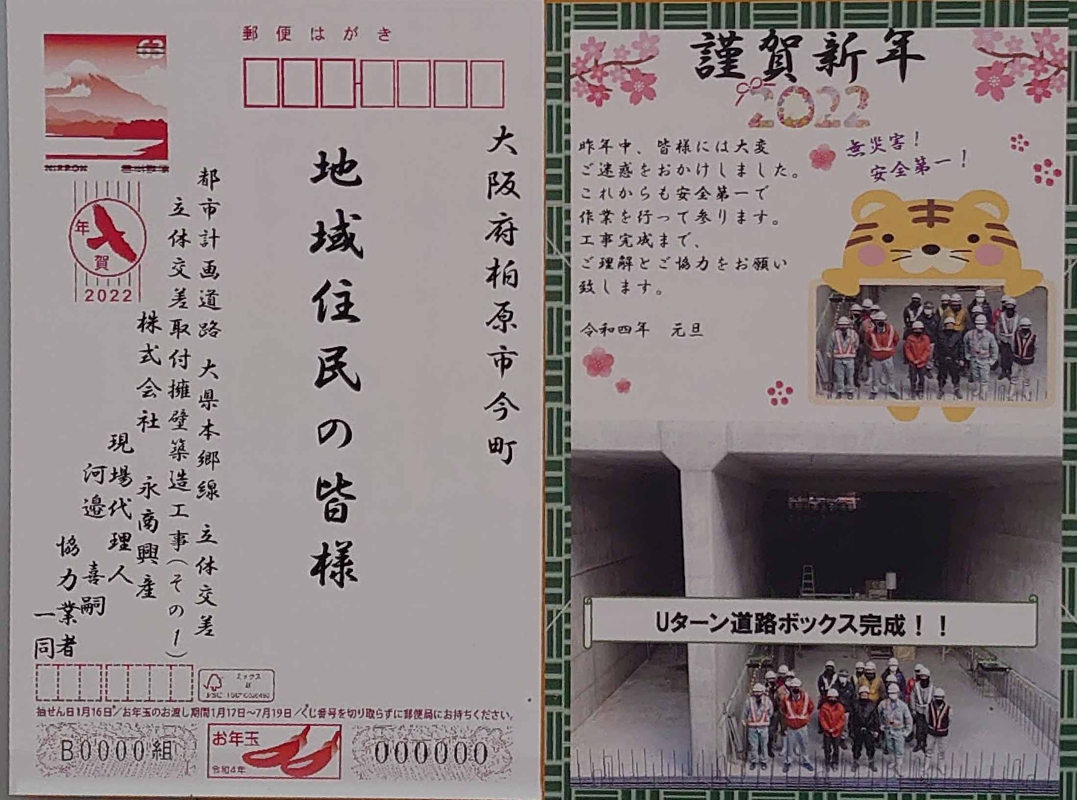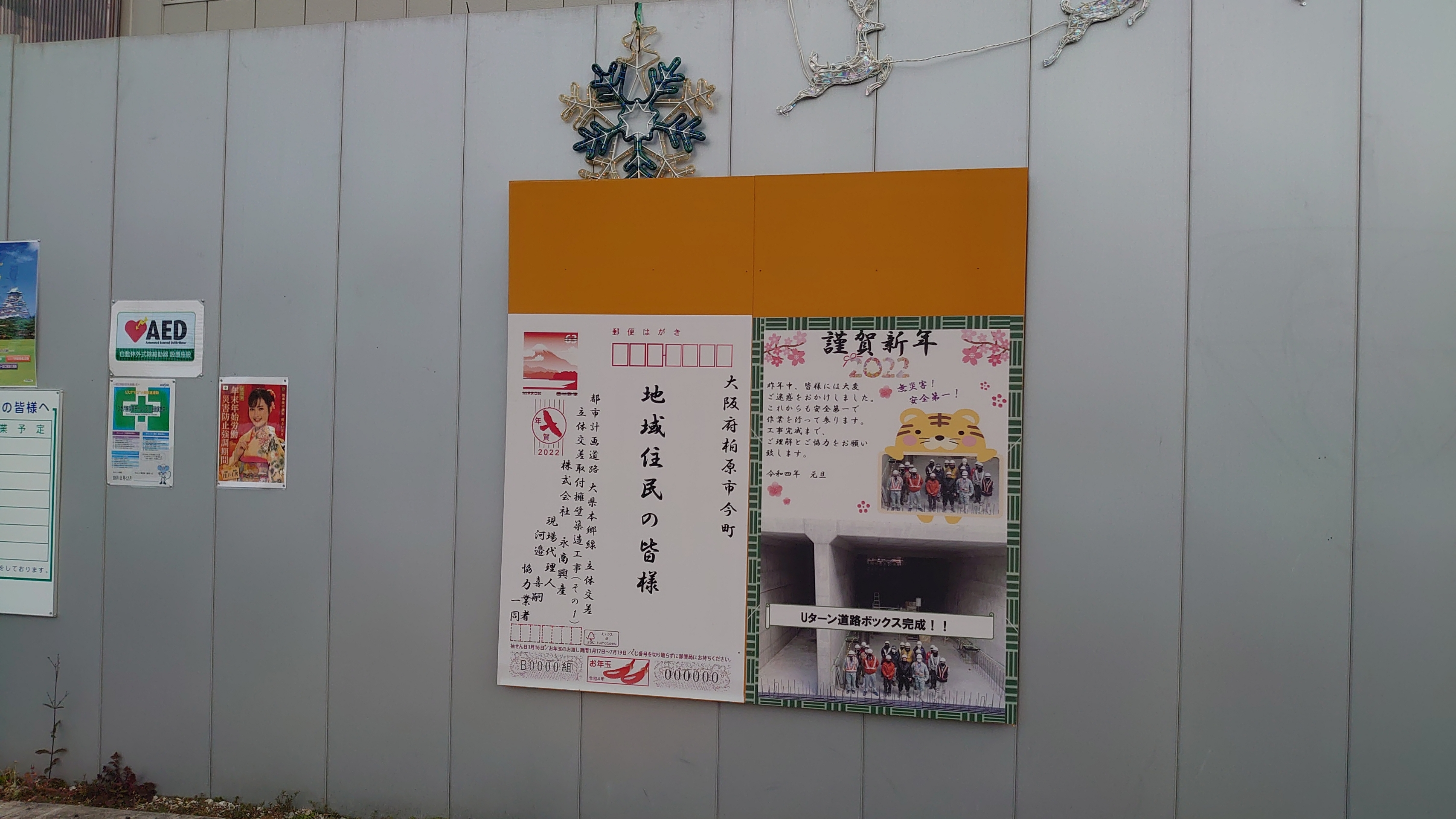 大県本郷線のアンダーパス工事の西側、工事現場の仕切り板のところに、工事業者さんの粋な計らいで、どでかい年賀状が貼られていました。