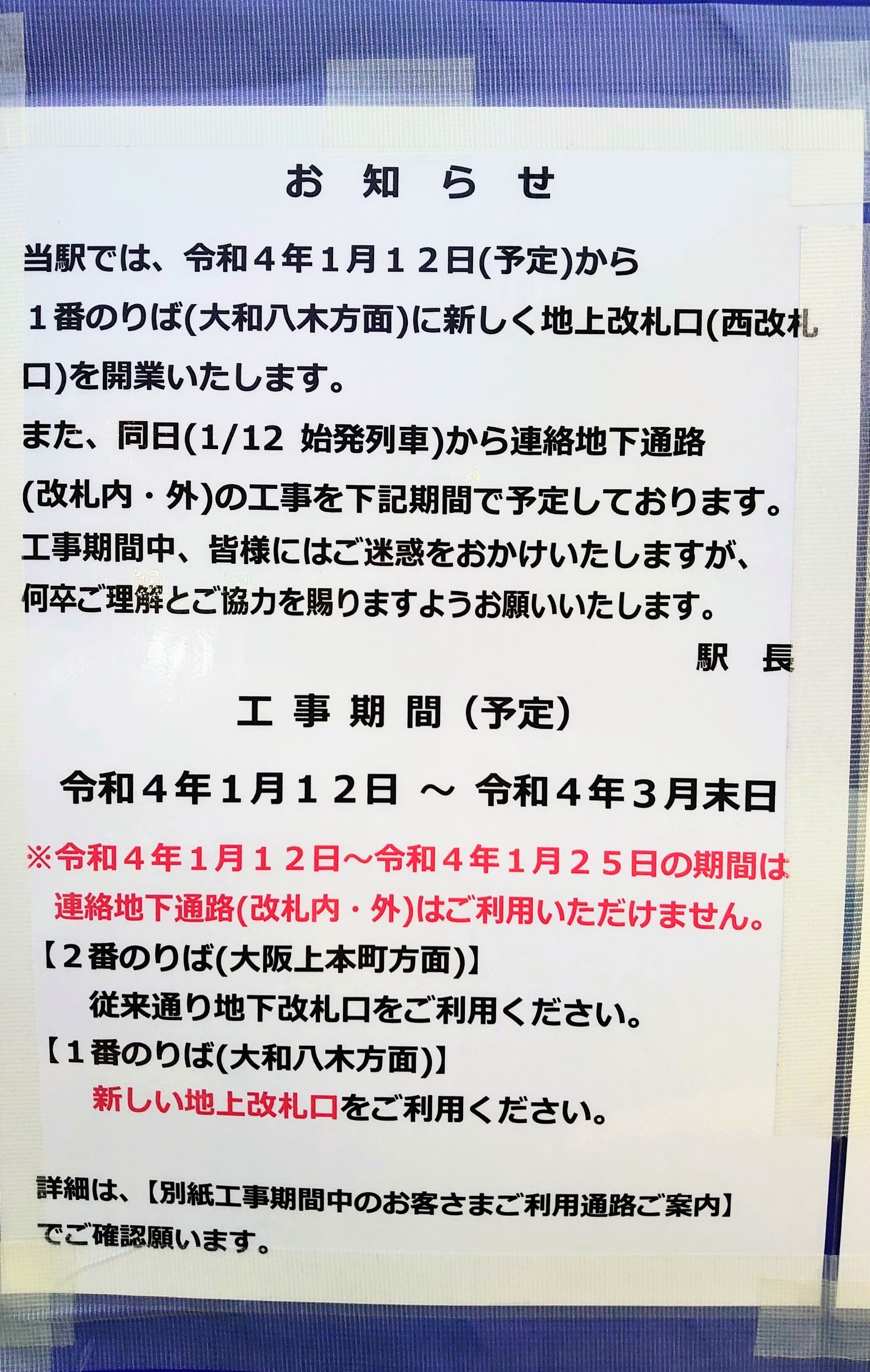 また、12日㊌から25日㊋まで、工事のため地下通路が使えません。