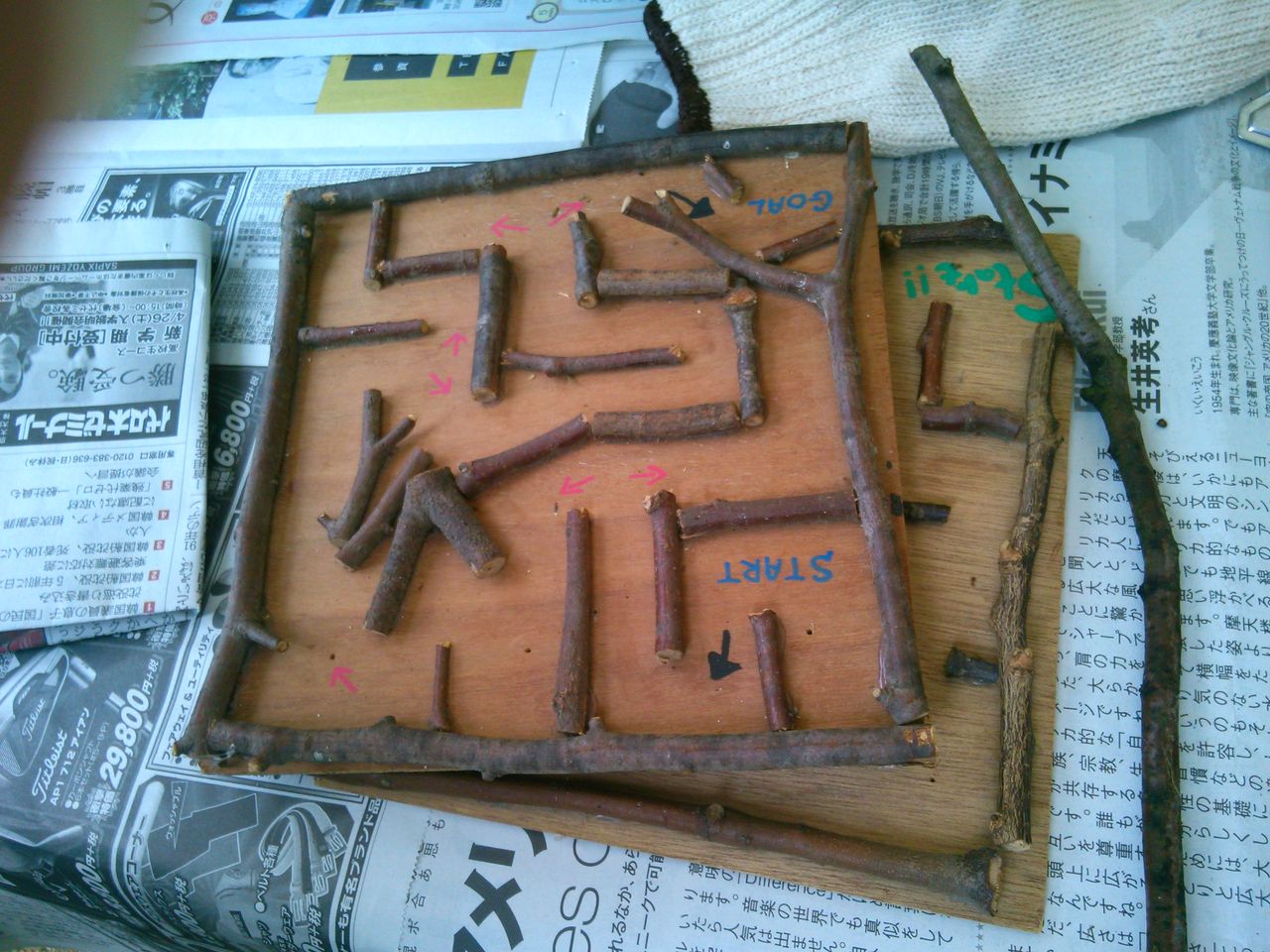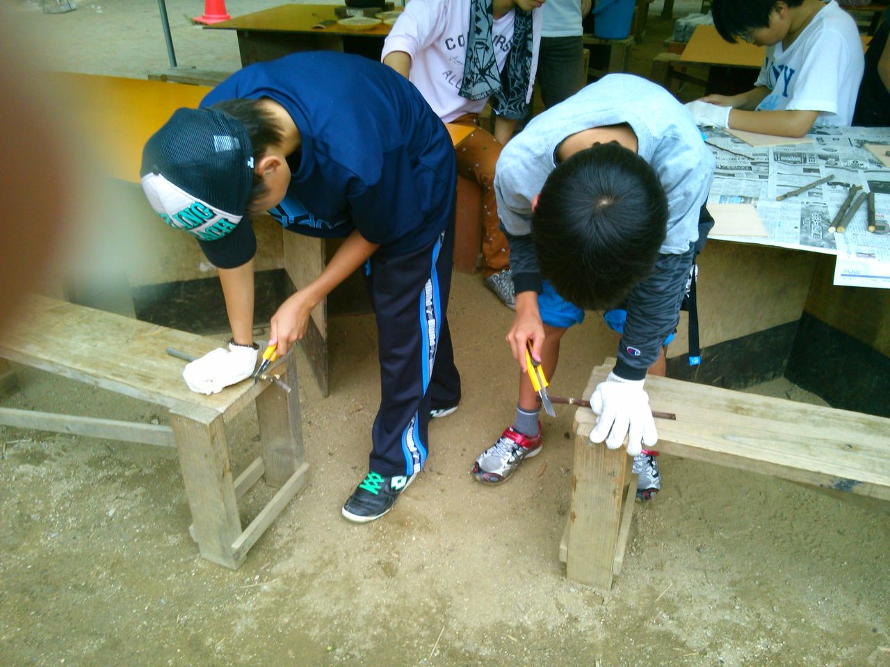 写真はクラフト作りの様子、木の迷路と竹ぽっくりを作りました。