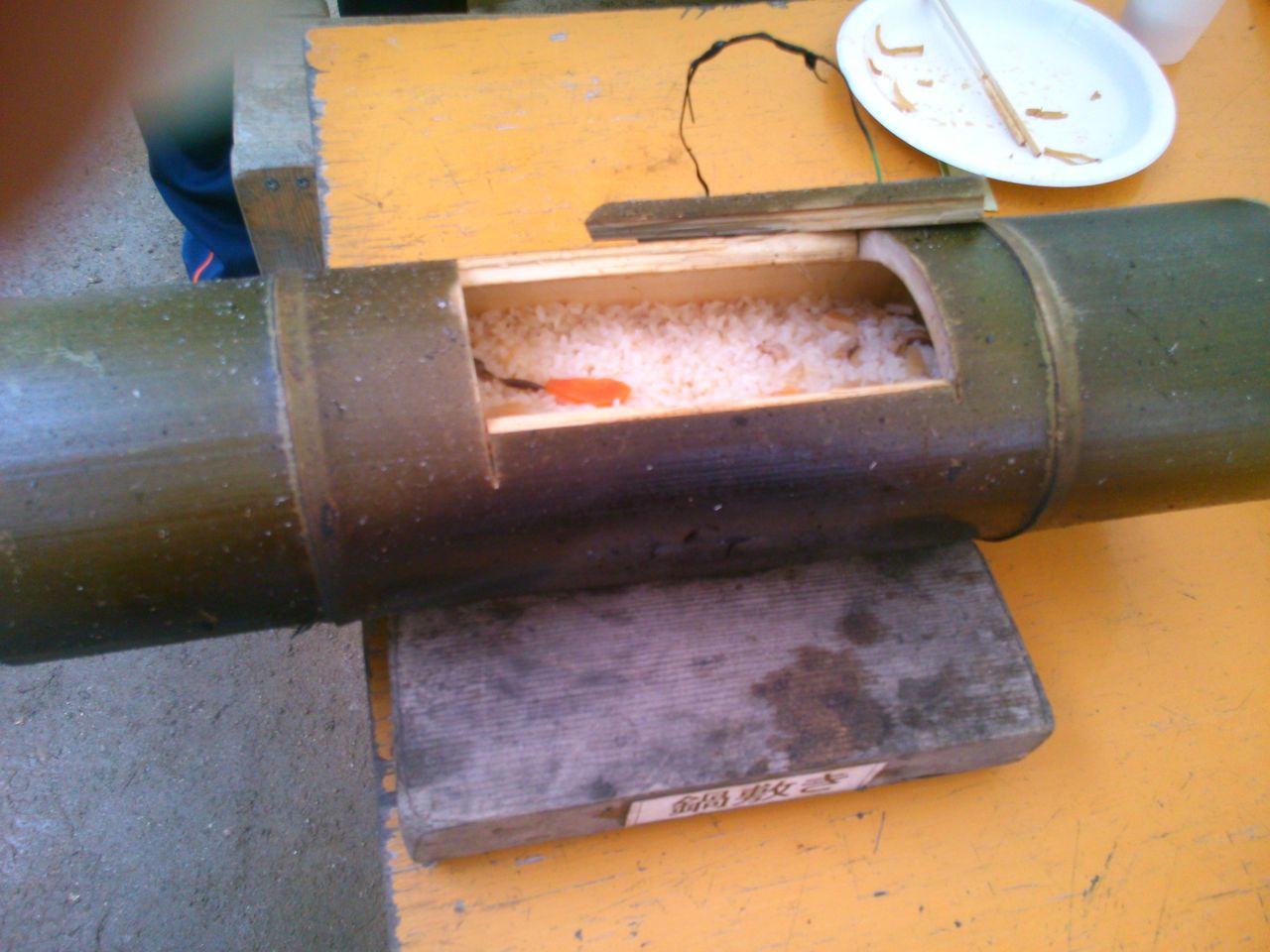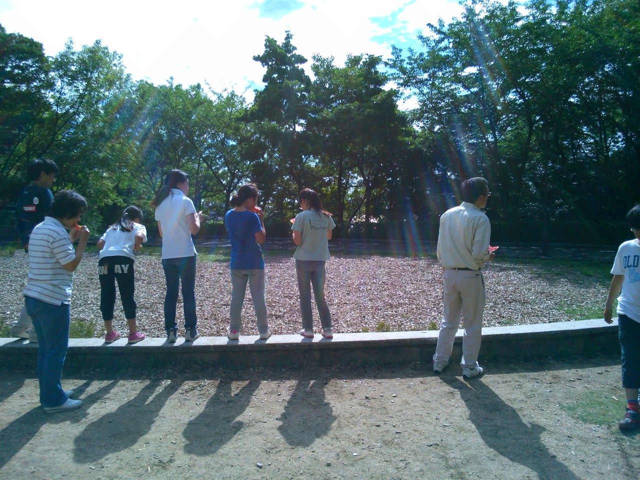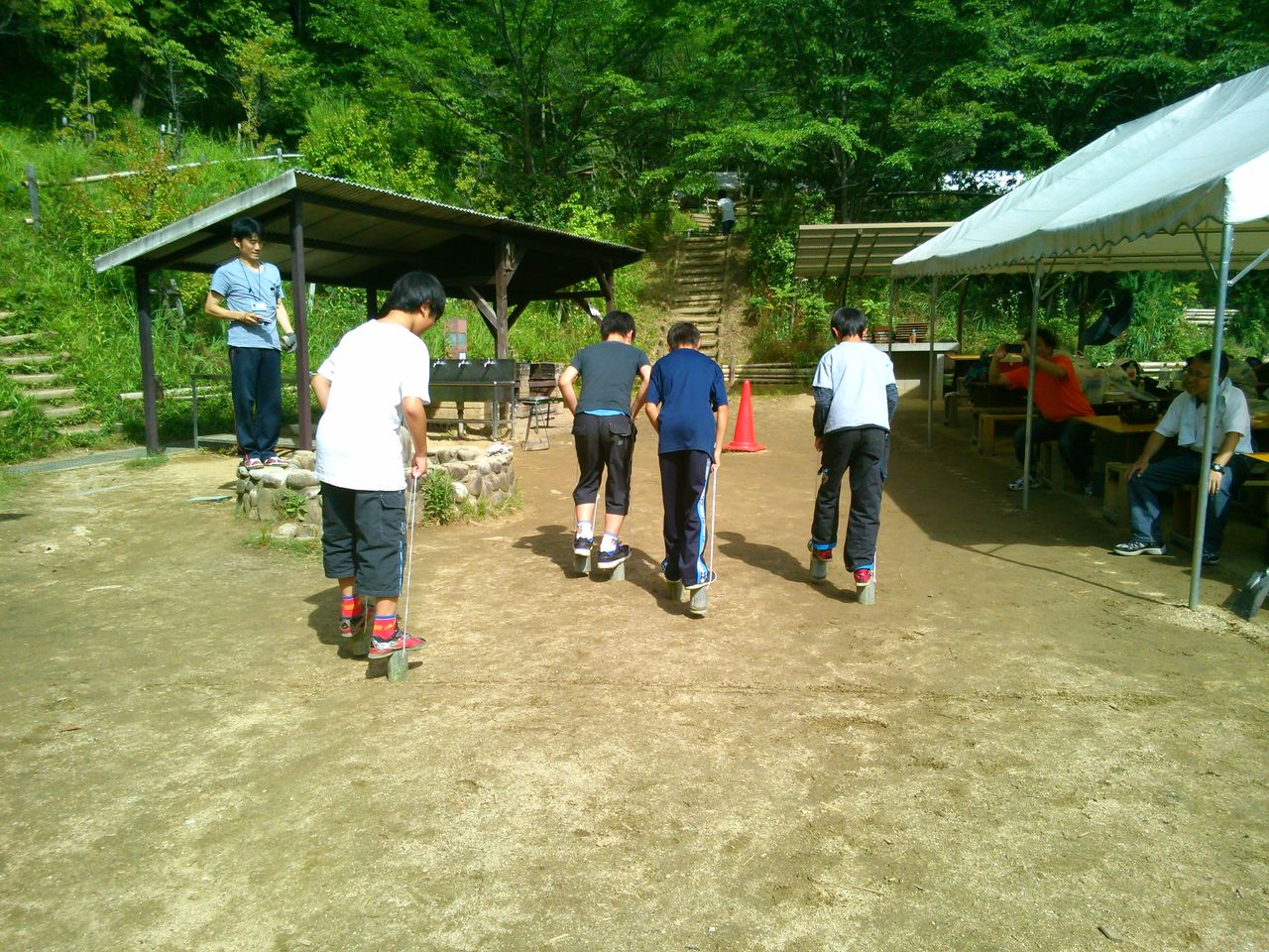 竹ぽっくりでみんなで競争しました。そのあと、スイカの種飛ばし。